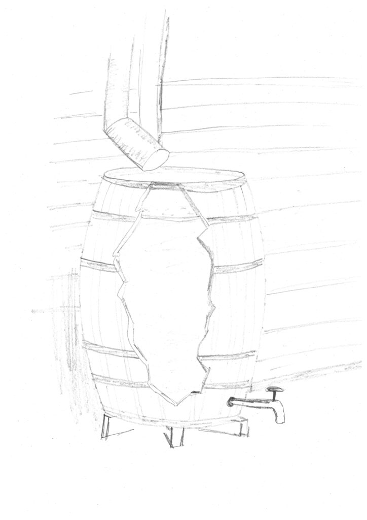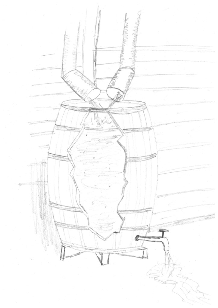 Was tun? Der Abfluss hat eine begrenzte Kapazität. Weitere anzubringen ist bei einem vollen Fass vielleicht nicht die beste Idee. Sie könnten versuchen, das Wasser mit einem großen Eimer abzuschöpfen und so das Fass vor dem Überlaufen zu bewahren.